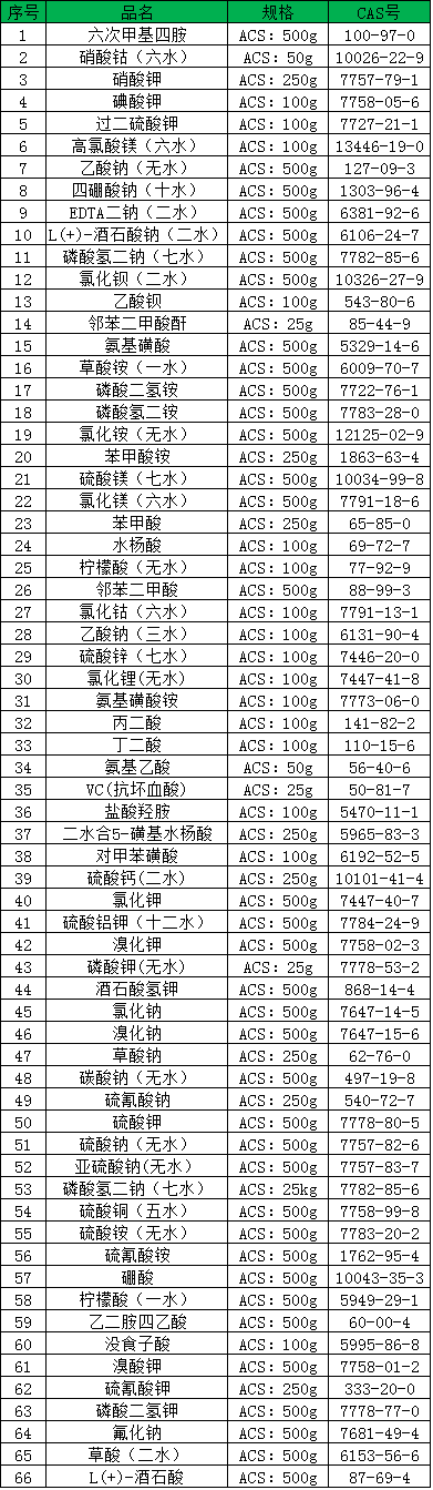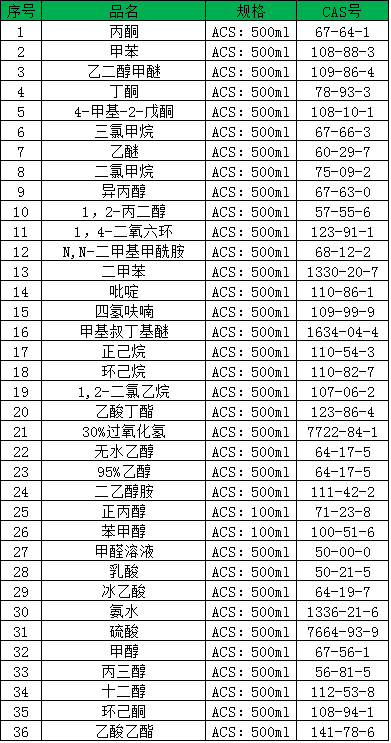 目前,南京試劑ACS標(biāo)準(zhǔn)品種達(dá)102個(gè) (詳見下表),在研發(fā)、檢測(cè)團(tuán)隊(duì)的努力下,品種還將持續(xù)增加。需要ACS規(guī)格產(chǎn)品的客戶朋友,可以放心采購(gòu)啦!查詢采購(gòu),請(qǐng)登錄“南京試劑”商城(http://m.cinostar.com.cn/)。若有包裝規(guī)格、物流配送等特殊需求,請(qǐng)致電咨詢,服務(wù)熱線:400-000-6972。