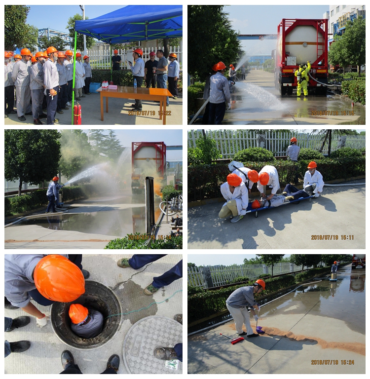7月19日下午,公司組織安全、環(huán)保、消防綜合預(yù)案演練。15時許,原料罐區(qū)模擬“10噸甲醇原料槽車卸料底閥無法關(guān)閉發(fā)生泄漏”,接生產(chǎn)分廠和門衛(wèi)總值班報告后,應(yīng)急救援領(lǐng)導(dǎo)小組總指揮宣布啟動應(yīng)急預(yù)案,各應(yīng)急救援小組接到通知后,緊急趕赴事故現(xiàn)場。警戒組現(xiàn)場進(jìn)行了隔離疏散;醫(yī)療救護(hù)組對“中毒人員”進(jìn)行救治并送往醫(yī)院;義務(wù)消防隊、搶險搶修組對泄露的“甲醇”進(jìn)行切斷、吸附、通風(fēng)、稀釋、回收等應(yīng)急處理;環(huán)保監(jiān)測組關(guān)閉公司對外雨污排總閥,開啟事故池閥門,及時封堵現(xiàn)場雨水口,并對現(xiàn)場泄漏物進(jìn)行檢測監(jiān)控。至15:30許,總指揮宣布解除警戒,演練結(jié)束。