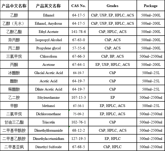 部分品種(如乙醇)質(zhì)量可同時符合中國藥典/美國藥典/歐洲藥典等多國藥典標(biāo)準(zhǔn)要求,以滿足不同客戶需求;